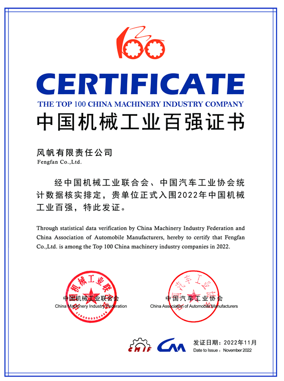 12月28日,中國機械工業(yè)聯(lián)合會和中國汽車工業(yè)協(xié)會聯(lián)合發(fā)布了2022年中國機械工業(yè)百強企業(yè)、汽車工業(yè)整車二十強企業(yè)、零部件三十強企業(yè)名單。風(fēng)帆有限責(zé)任公司入選第18屆“中國機械工業(yè)百強”榜單。“百強”評選活動旨在總結(jié)2022年機械工業(yè)所取得的成績,進一步發(fā)揮行業(yè)骨干企業(yè)示范引領(lǐng)作用,引導(dǎo)行業(yè)企業(yè)持續(xù)做強、做優(yōu)、做大,加快產(chǎn)業(yè)轉(zhuǎn)型升級,培育發(fā)展新動能,推動行業(yè)高質(zhì)量發(fā)展。