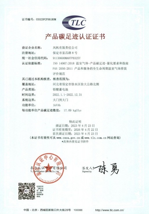 近年來,風帆公司積極響應國家“雙碳”政策,堅持科技風帆、綠色發(fā)展,經(jīng)濟發(fā)展與節(jié)能環(huán)保并重, 不斷優(yōu)化產(chǎn)品和設備工藝,加強技術創(chuàng)新,狠抓節(jié)能減排項目,推進綠色低碳、可持續(xù)發(fā)展,促進產(chǎn)業(yè)升級轉(zhuǎn)型,努力打造鉛酸蓄電池行業(yè)生態(tài)環(huán)保標桿企業(yè)。本次獲得“產(chǎn)品碳足跡認證證書”和“溫室氣體核查聲明”,標志著公司在實現(xiàn)“碳達峰、碳中和”目標上邁出了實質(zhì)性一步。