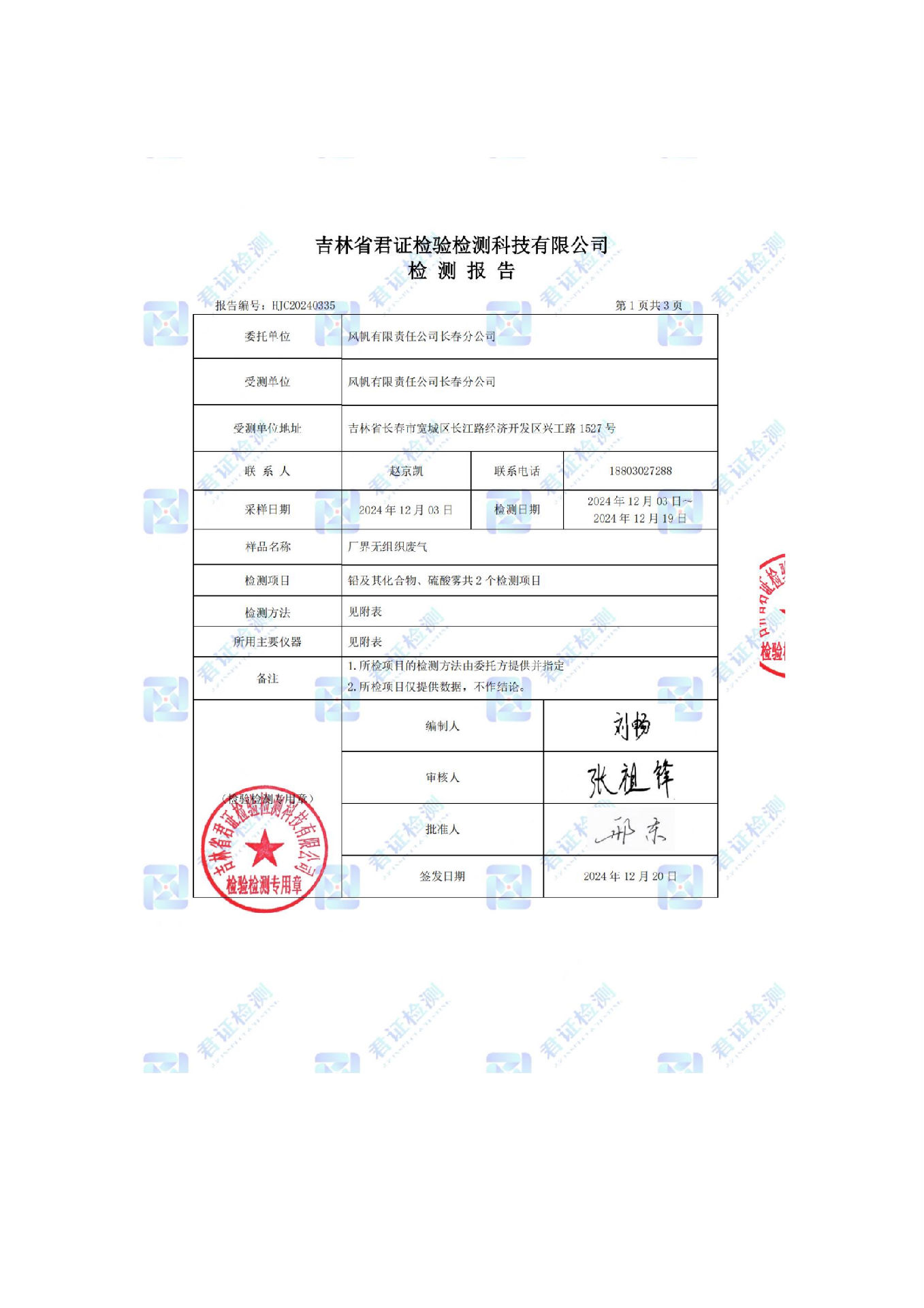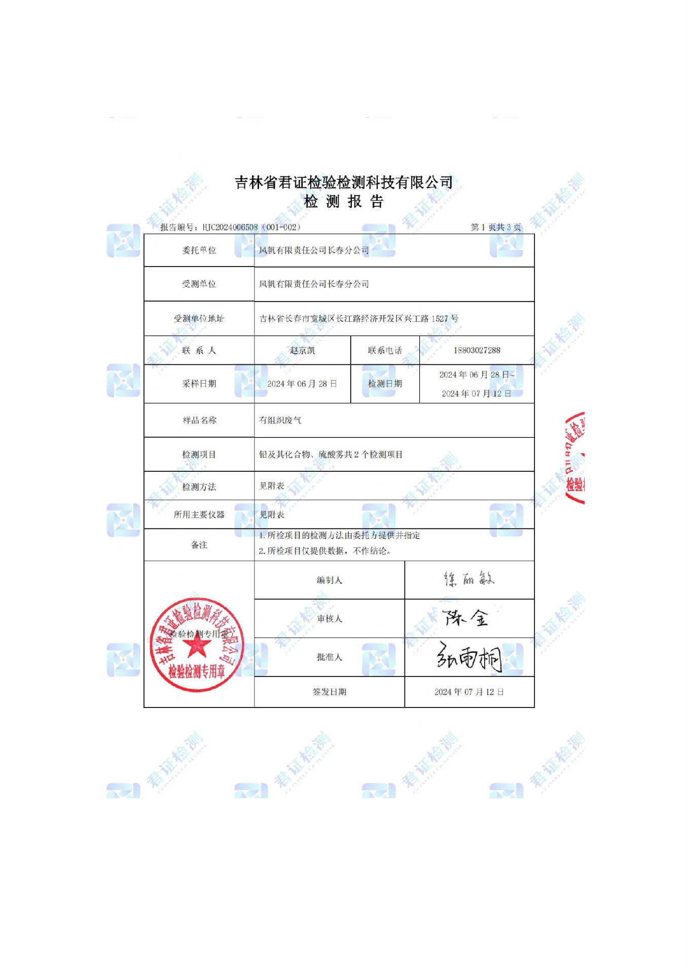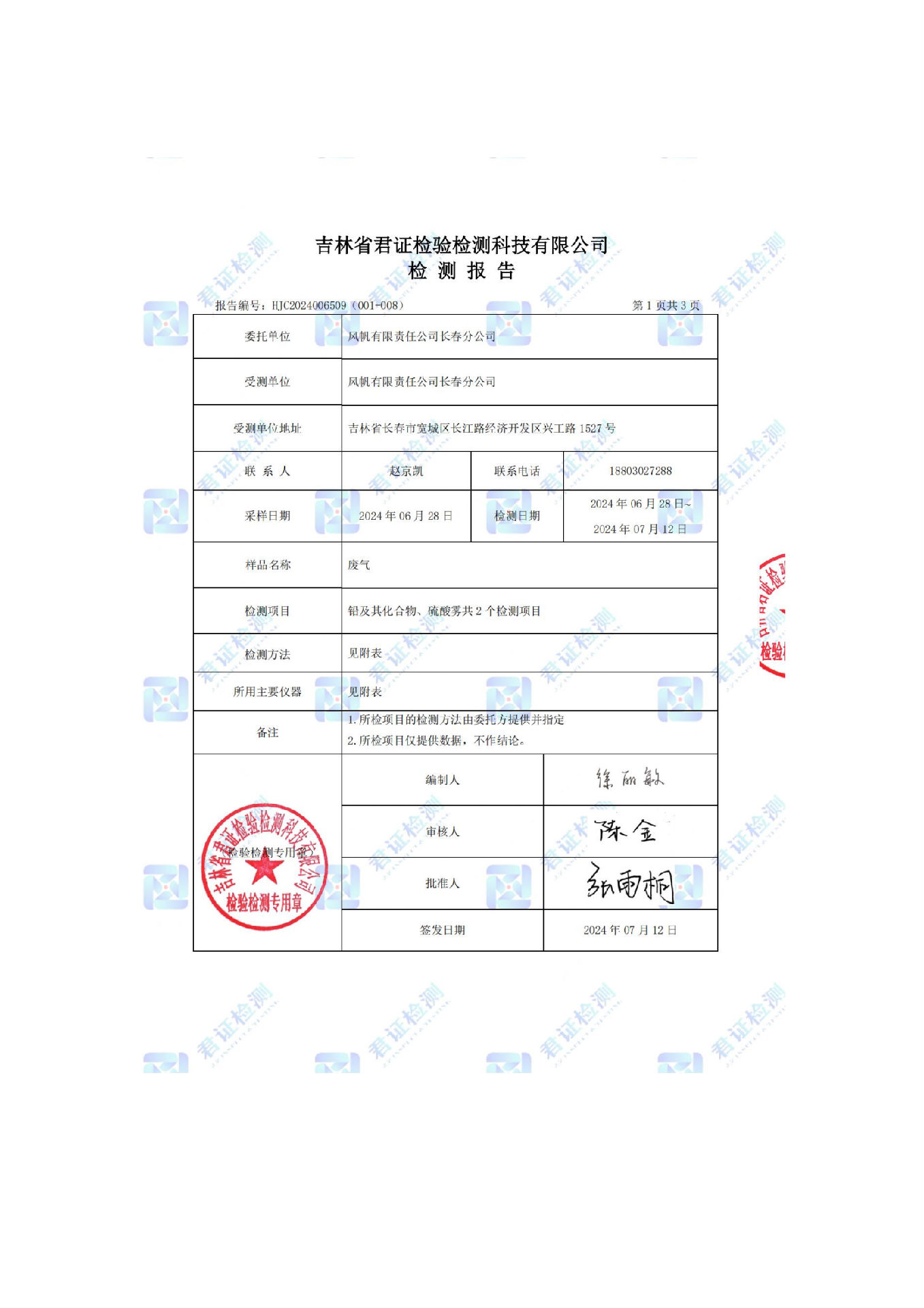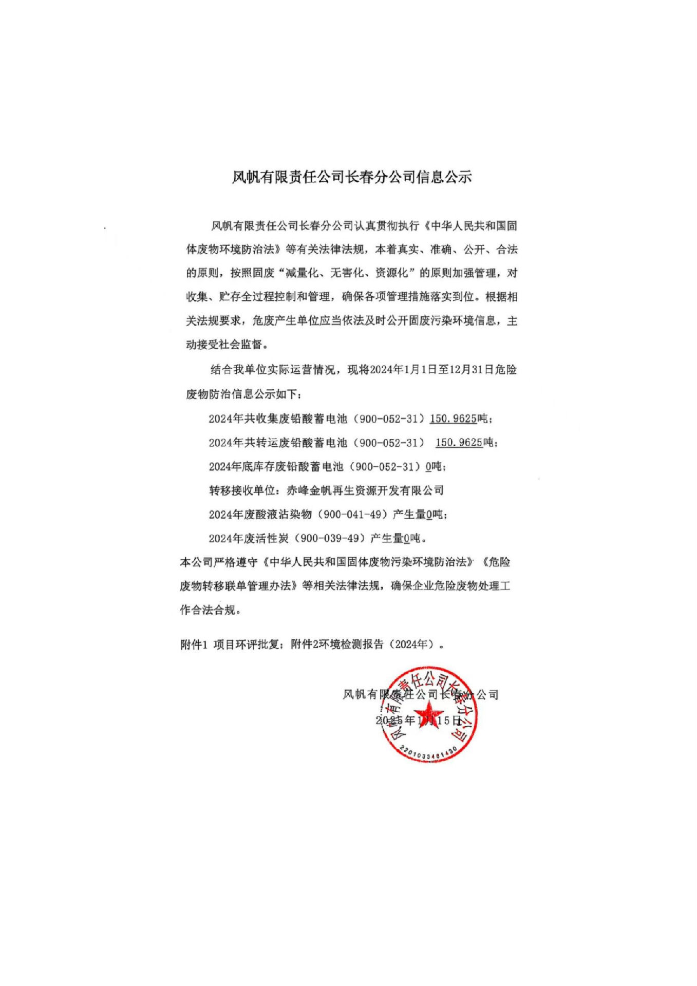 風(fēng)帆有限責(zé)任公司長(zhǎng)春分公司2024年危險(xiǎn)廢物污染防治信息公示