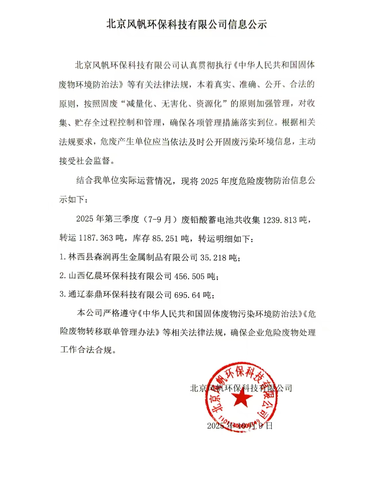 北京風(fēng)帆環(huán)??萍加邢薰?025年第三季度危險廢物信息公示